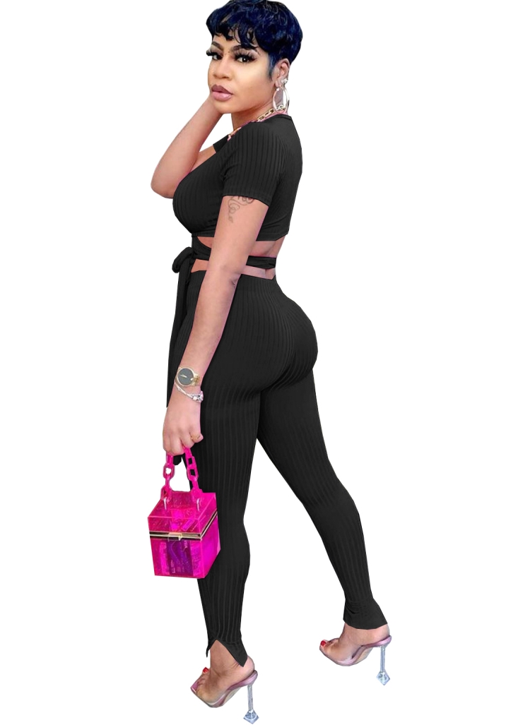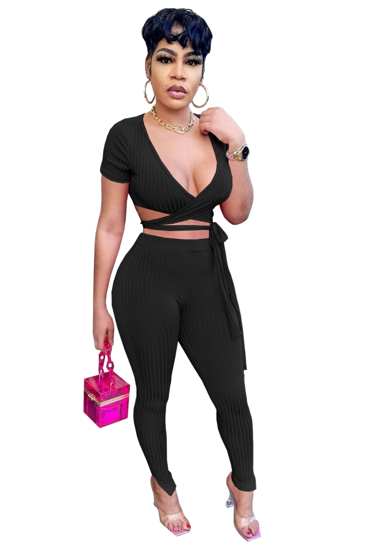 • Product Name: Black Ribbed Wrap knotted Crop Top and Pants Two Piece Set